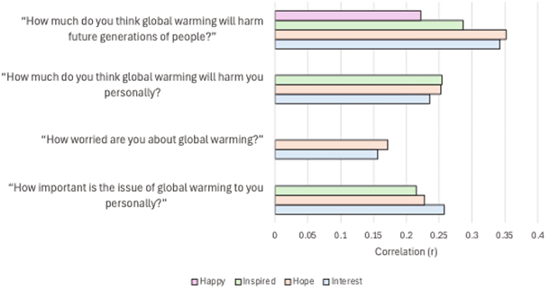 Overall, for the HU section with primarily negative content, there wasn’t a significant relationship between climate attitudes and beliefs captured by individual SASSY items (Chryst et al., 2018) and positive emotions, except for the personally relevant item. Only the personal harm caused by climate change was linked to a weak correlation with positive emotions in the HU section, r (173) = .162, p = .033. Given the limited research, the relationships between individual positive words and SASSY items during the COA section of the museum are presented in Table 2 and Figure 2. As depicted in Figure 2, a small to moderate association was found.