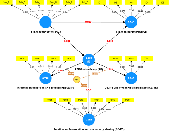 Figure 2 presents the PLS-SEM path model, including the outer loadings (black), effect sizes (f²; red), and explained variance (R²; white), processed using SmartPLS software. The R² values indicate that academic achievement (AC) accounts for 7.6% of the variance in self-efficacy (SE), while SE explains 30.5% of the variance in career interest (CI). These results support the model’s explanatory power and address Research Question 3, which explores the role of STEM-related self-efficacy in shaping career interest.