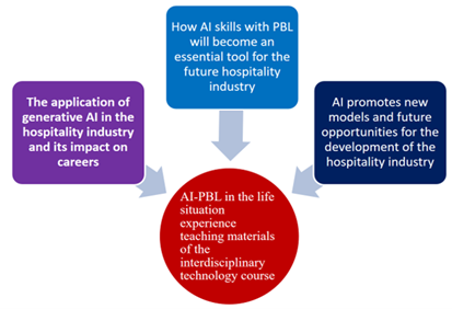 Teaching material of textbook (I) lets each group of hospitality students discuss the difference between AI and HI. Types and development history of AI? The application of generative AI in the interdisciplinary technology field? How do each group of students plan their future careers to link with AI?